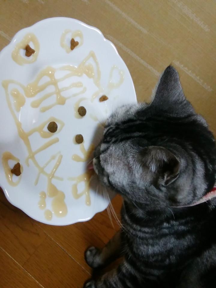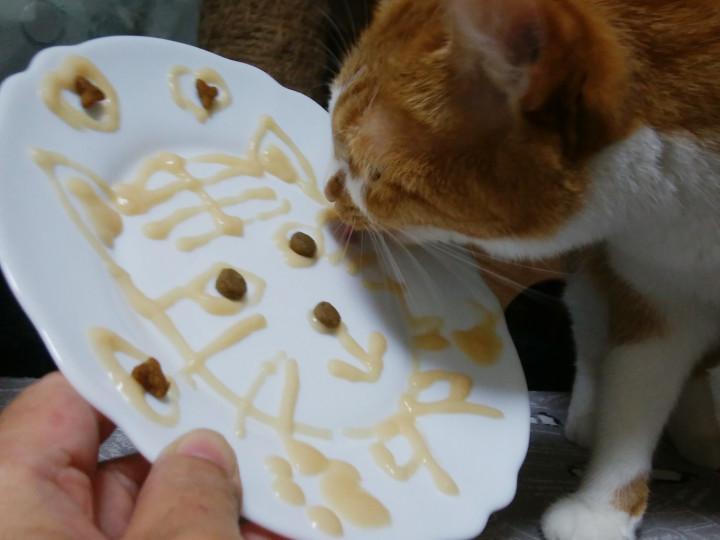 白い皿にちゅーるとカリカリで絵を描いてみました。