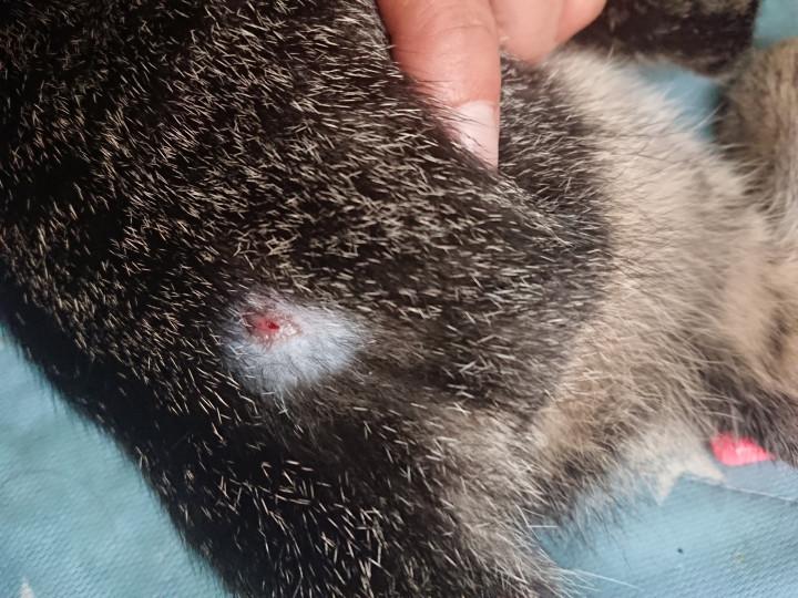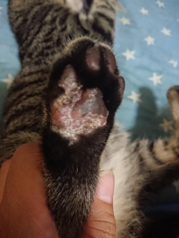 このバケてる部分と肉球の腫れは怪我してそれが悪化したのかな?って💦耳のハゲも💦真菌とは違うんですか?って聞いたら真菌の可能性も捨てきれないから真菌の塗り薬をいただきました✨これで良くなりますように🙏