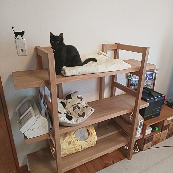 で、そこを片付け、この棚、なんちゃってキャットタワーにできるかも?って。