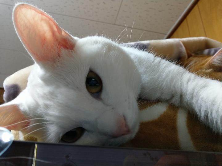 冷蔵庫の上のベッドで寝ている餅子嬢
