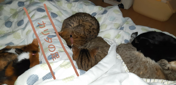 消灯時はカリタと一緒にいたのはドラくんだけだったけど、夜中に気づけば全ニャン集合🐈