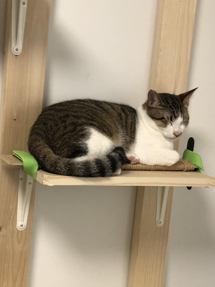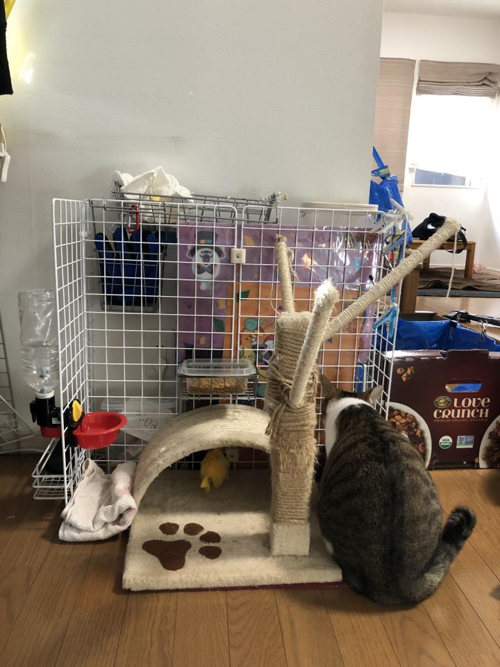 先日爪研ぎを作ってキャットタワーに取り付けたらムギ氏の寝床化した。笑