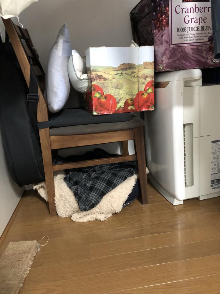寝床は仮で暖かいエアコンの下に