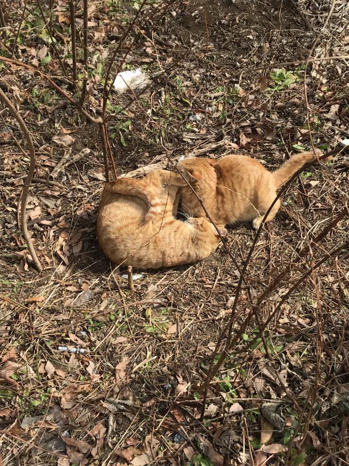 たまたまお昼を買いに入ったコンビニで仲良しの茶トラ兄弟がじゃれてるのを見かけました