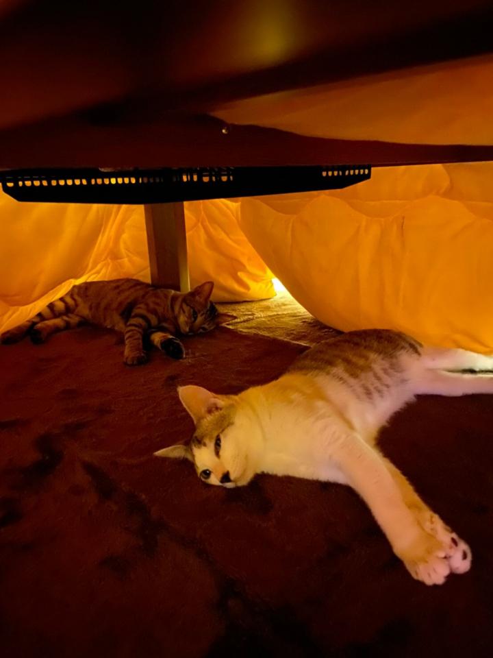 猫はこたつで丸くならずに伸びちゃってますね〜〜!