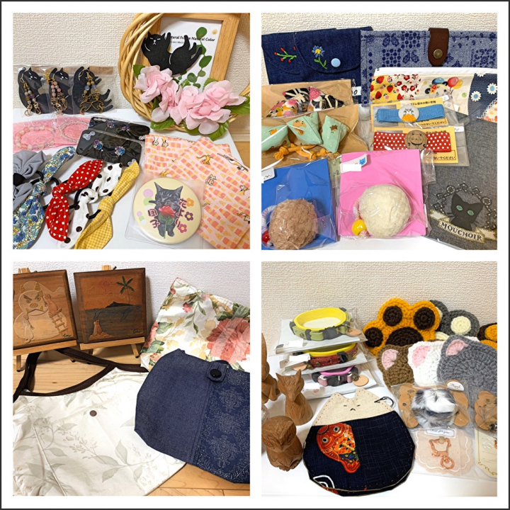 首輪・アクリルたわし・木彫りの置物・猫チャーム・猫コースター。