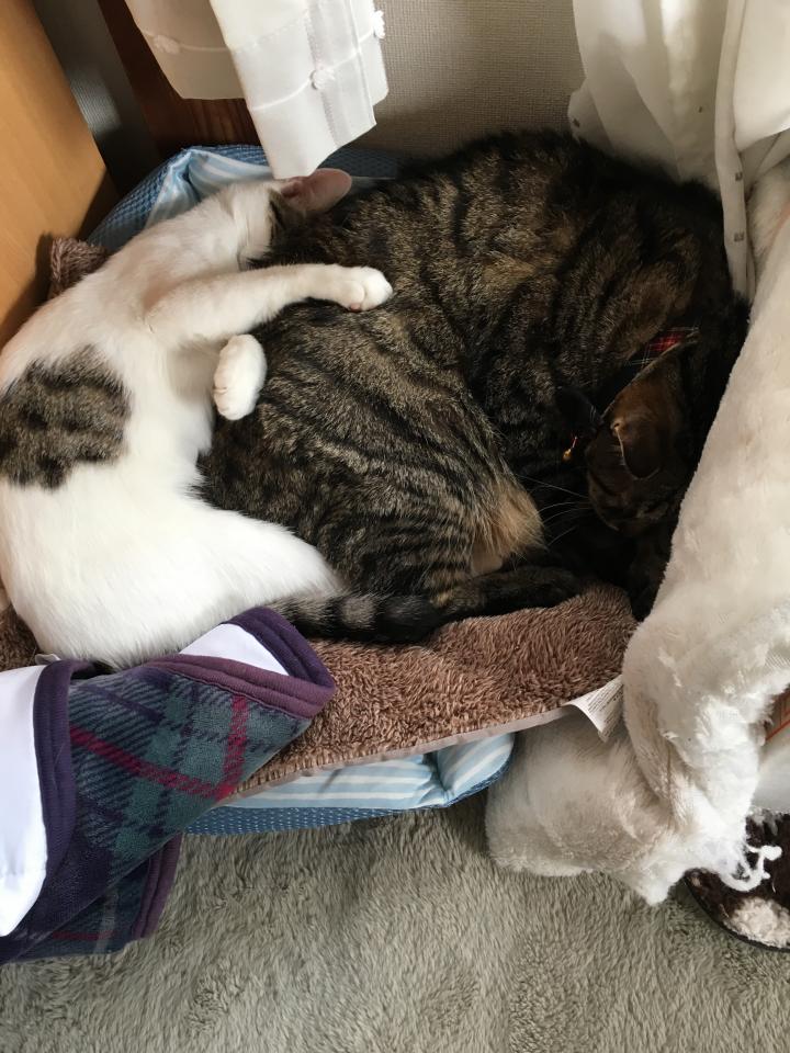 可愛いけど、何故その狭い隙間に入ってくっ付いて寝るのか笑