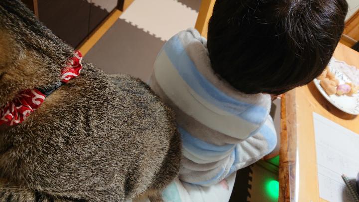 7ヶ月のムサシさん。まだまだ息子と母さんの膝を取り合いするくらい甘えん坊🍭