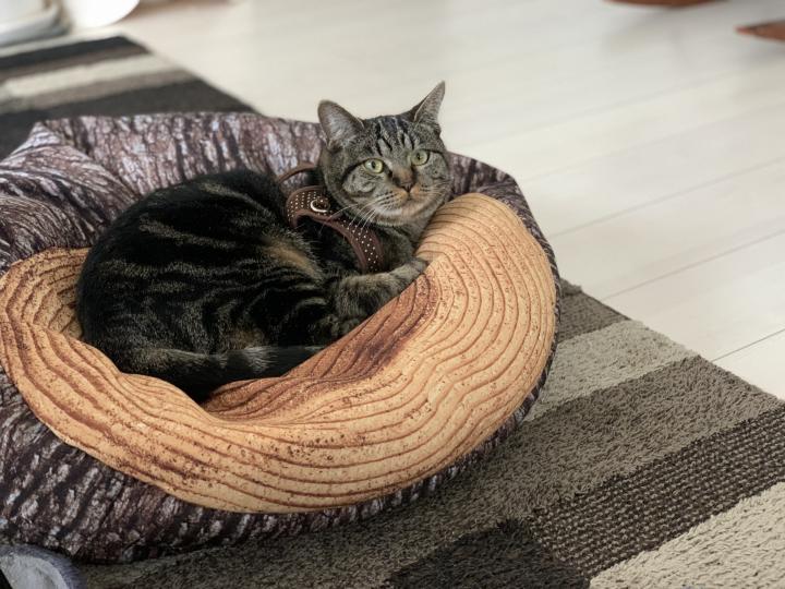 リビングにいる時はだいたいこの上か、パンを盗むためにパントリーを狙っています。
