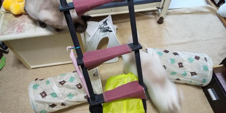 だいぶお互いの体の横を嗅ぎあったり、猫じゃらしタイムで譲り合ったり・・・