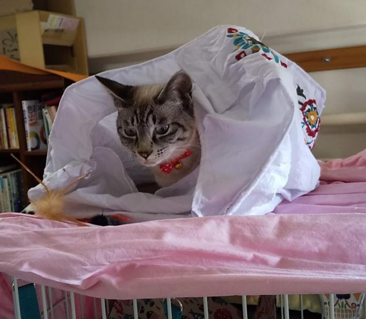 スイがいつも寝ていたケージ上に猫テントを置いてあげたら 嬉しそうに入っていました🎵