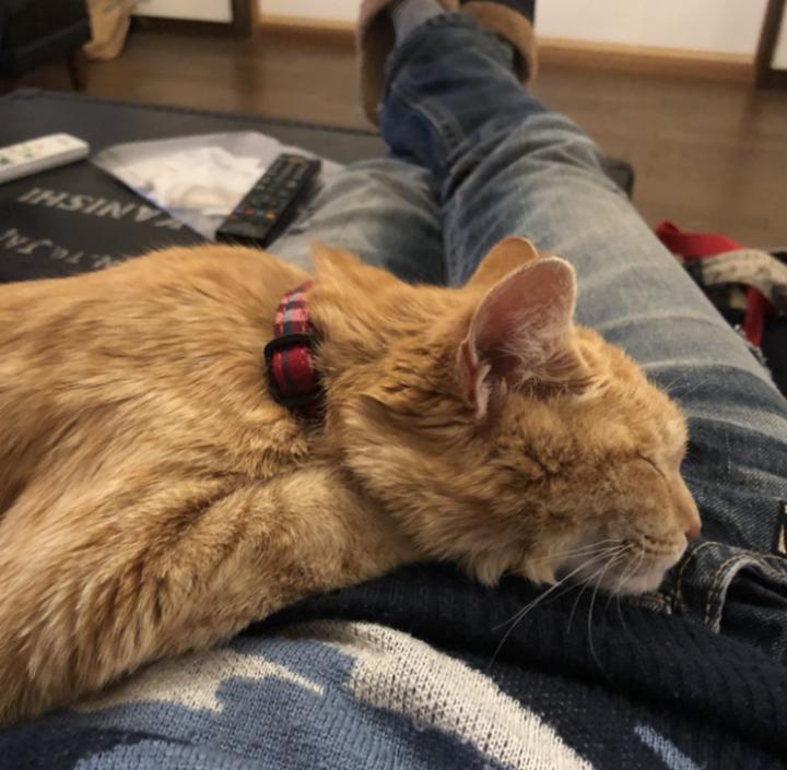 マモーはいつものように顎を私の足に乗せてくつろぎ、私はそんなマモーを腕でくるむようにしていました。