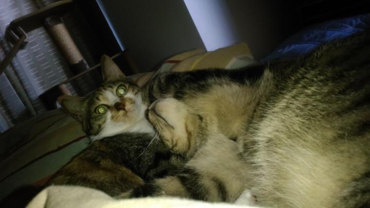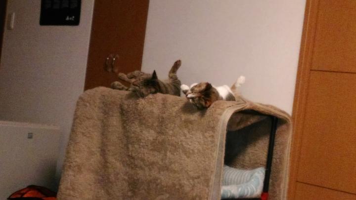 いつもと、変わらない、無防備なへそ天ニャンズにいやされております😊