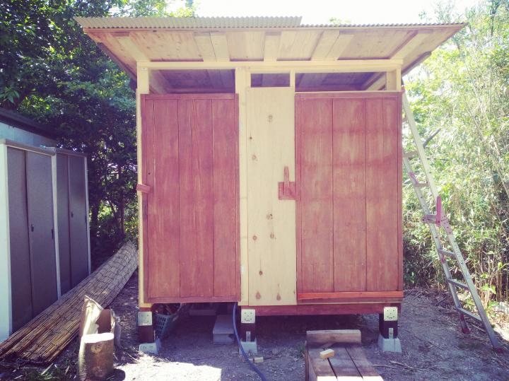 移住地では、ずっと予定していた薪風呂小屋がほぼ完成。