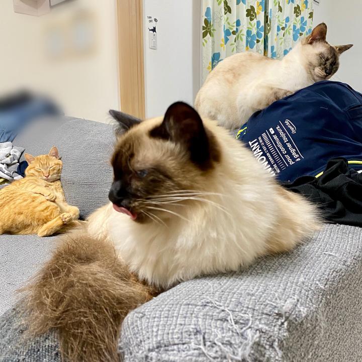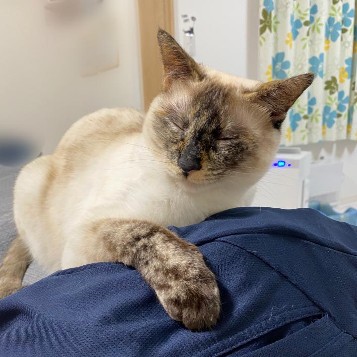 脱ぎ捨ててある兄ちゃんのジャージにくっつきながら、なにやら複雑な表情を浮かべている美鈴🐱