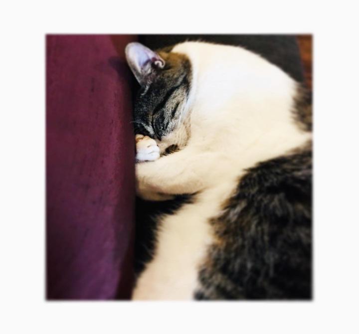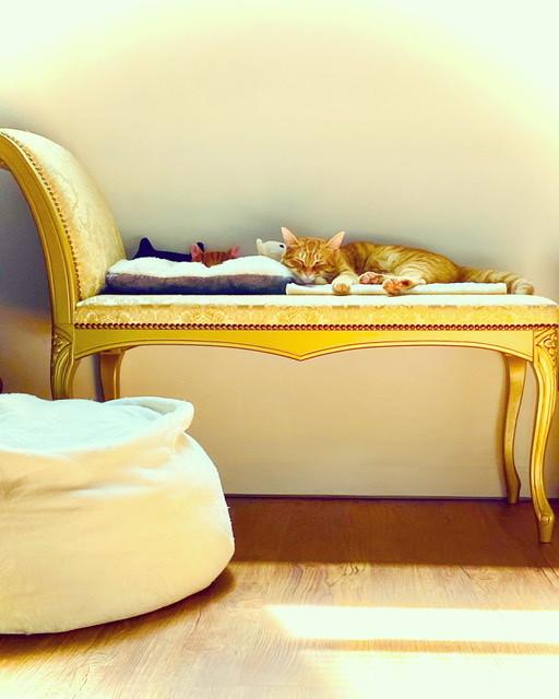 この写真はニャアちゃんの場所で、ニャアちゃんの愛用していたクッションに寄り添い、お昼寝するモカです。このクッション、ニャアちゃんが使っていた時のまま、洗ってないのです。モカはここが大好き。