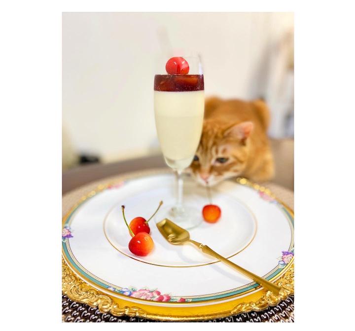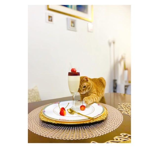 さくらんぼがとっても気になるモカ。その様子が堪らずパシャリ!、、可愛いっ♡