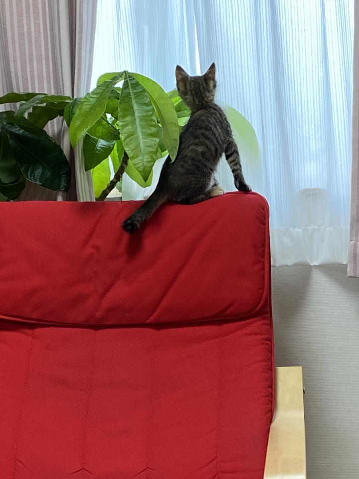 毎日ころころたまにどたばたと遊び、のびのびお昼寝し、もりもり食べています。来た時によく潜っていたケージ下の隙間にはもう入れなくなるほど大きくなり、踏み台なしで90センチくらいある窓枠にも乗れるようになるほどジャンプ力もついてきました。