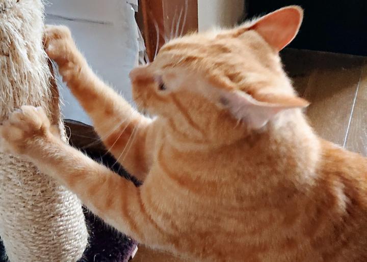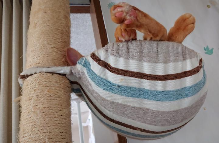 (爪とぎ、上部がボロボロ💦 0歳から使ってる小タワー。そろそろ替えないと…)