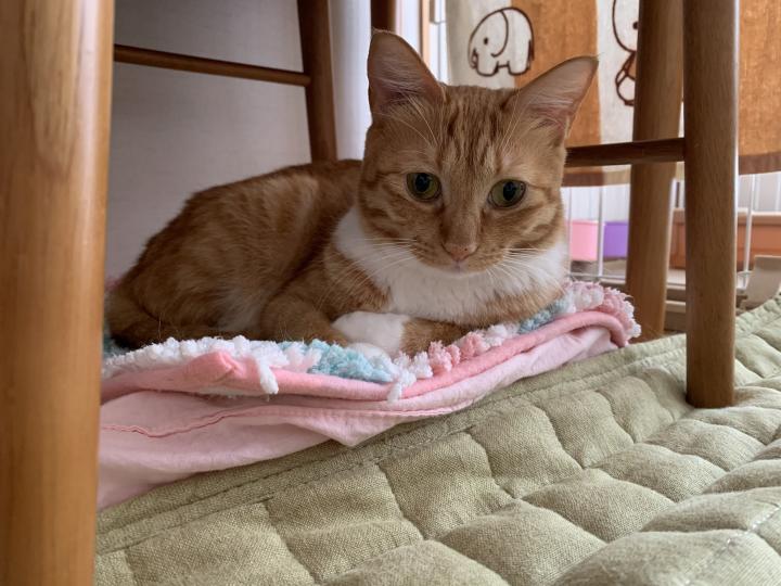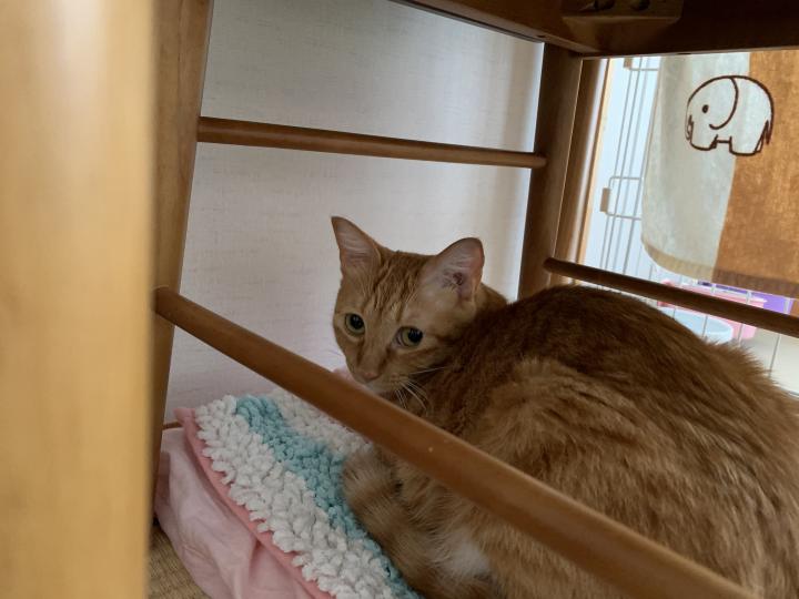 心なしか、反省中なのか、ケージから出されても、ベッドの下でこの表情のレオさん、、、