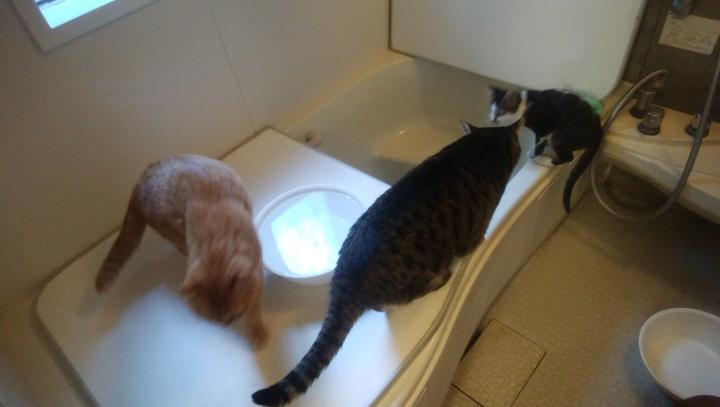 わたしがお風呂に入ってるときも、全員来ることが多い、、、😹マリンとレオはお水飲みにきて、ダンはついてきてるだけ、、、