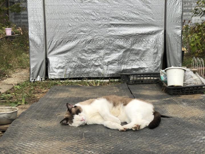 敷いてあるウレタンマットが程よく温かいらしくビニール倉庫前で寝転ぶ。