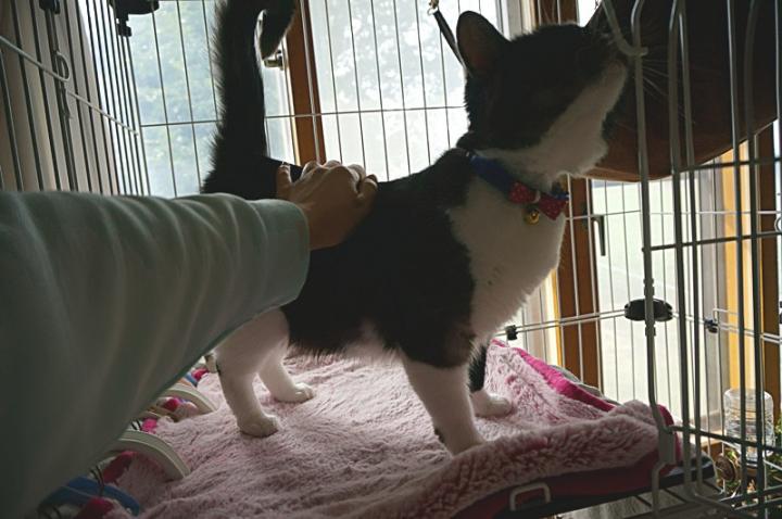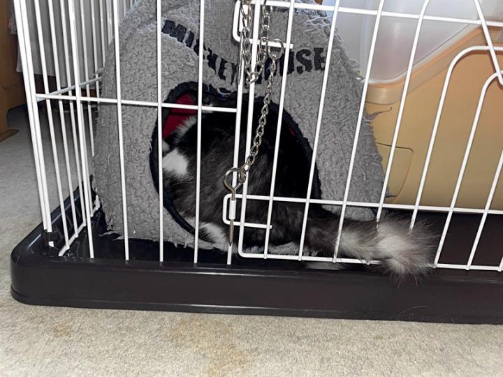 玄関フードと居間のキャットゲージと…居住区域は別々だから、チョビがお外で過ごしていた時と基本的には何も変わっていないからかな?