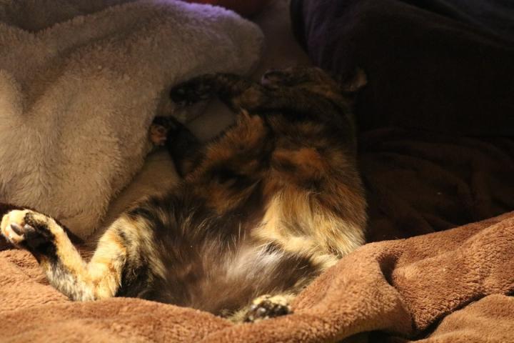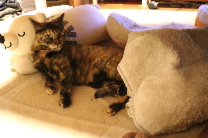 水を飲んでベットで毛繕いして安心してゴロゴロしています。