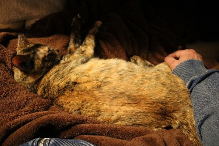 ブランケットを掛けている私の膝の上で寛ぐすずちゃん