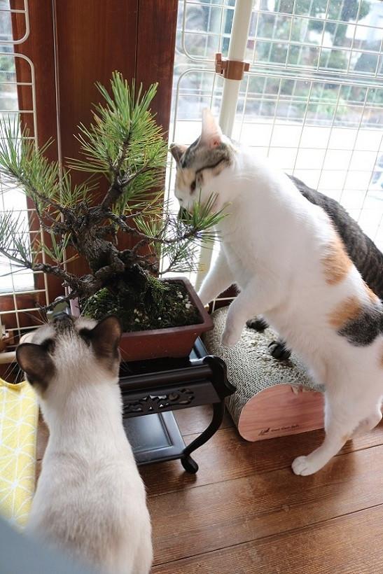 お正月にミニ盆栽の松を縁側に置くと集まる猫たち・・・