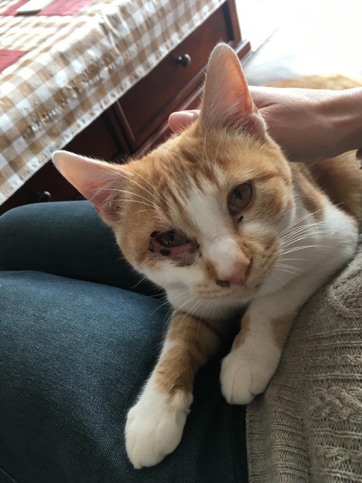 飼うことを決めてから動物病院に連れて行ったら、獣医さんがチューブの薬を目のふちにぶにっとしぼり、目をパチパチと閉じたり開けたりさせる処置をされました。