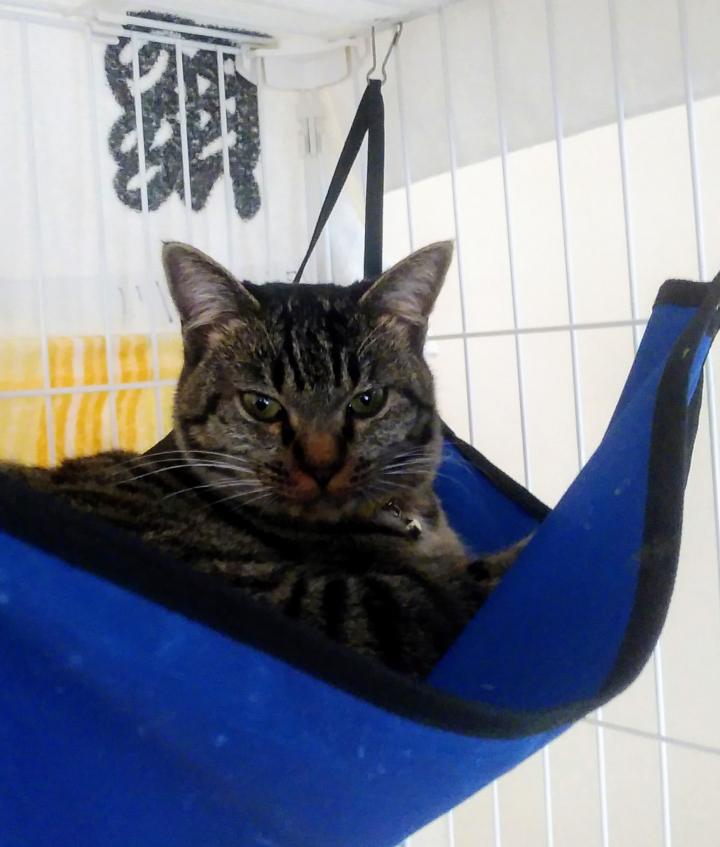 写真は、掃除機が嫌いでハンモックに避難している所です。