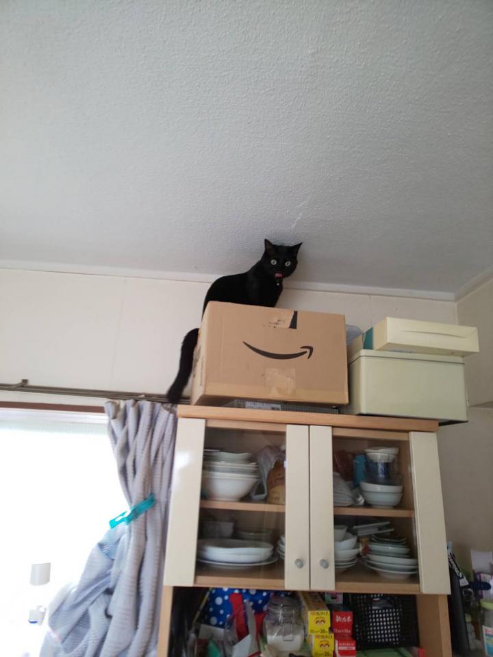 ↓そして、私を驚かせ発狂させた食器棚の上の、餌ストックが入った箱の上‼️😫💦