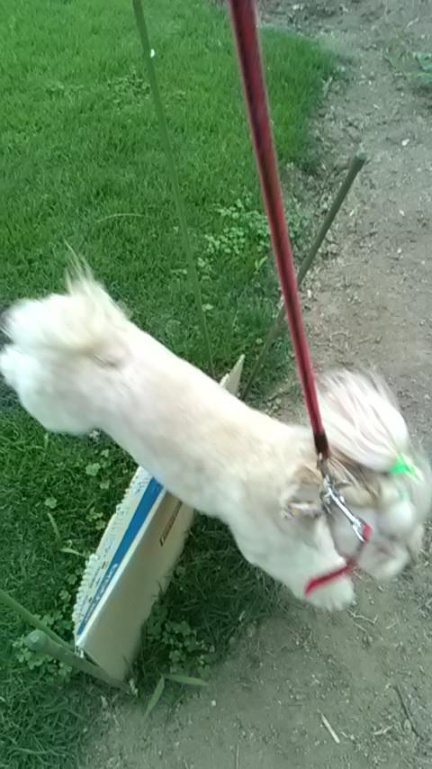 スクールの障害物は いつも跳んでるんだけど、今日は父ちゃんが段ボールで作った奴を超えたんだ💨