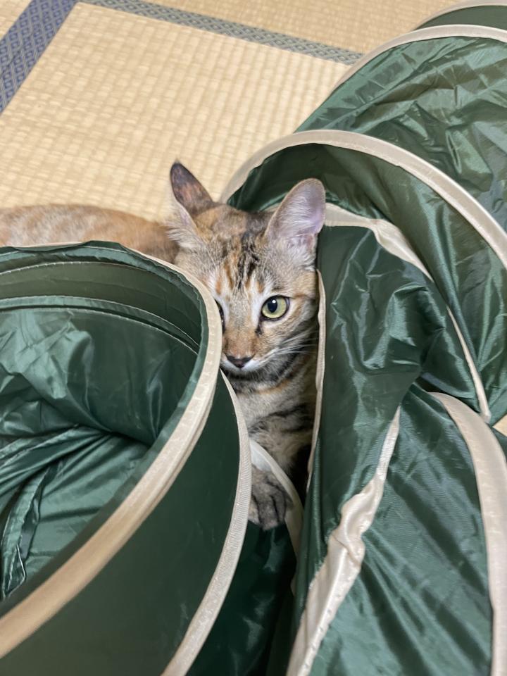 ダイソートンネルは中に入り、トンネル壁越しに動くじゃらしに興奮して飛びつくもんだからトンネル穴だらけよ。