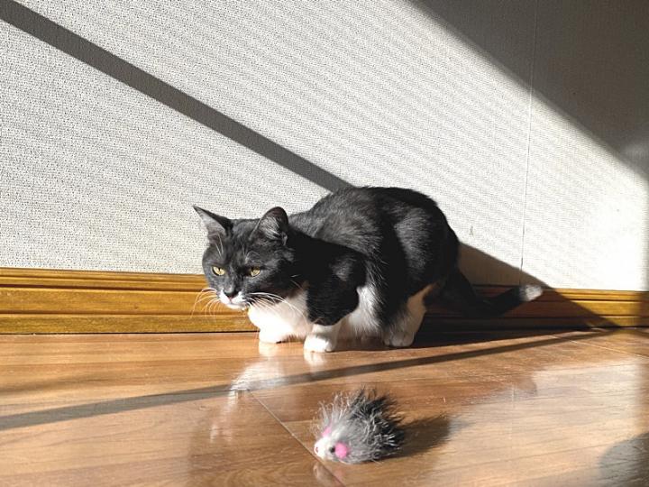 そこのダブルコートの灰色っぽいお猫さん、さっきまで散々私に戯れていたのに、今はほっぽらかして…全然違うところ見ているけど…実は油断させようとしているの?