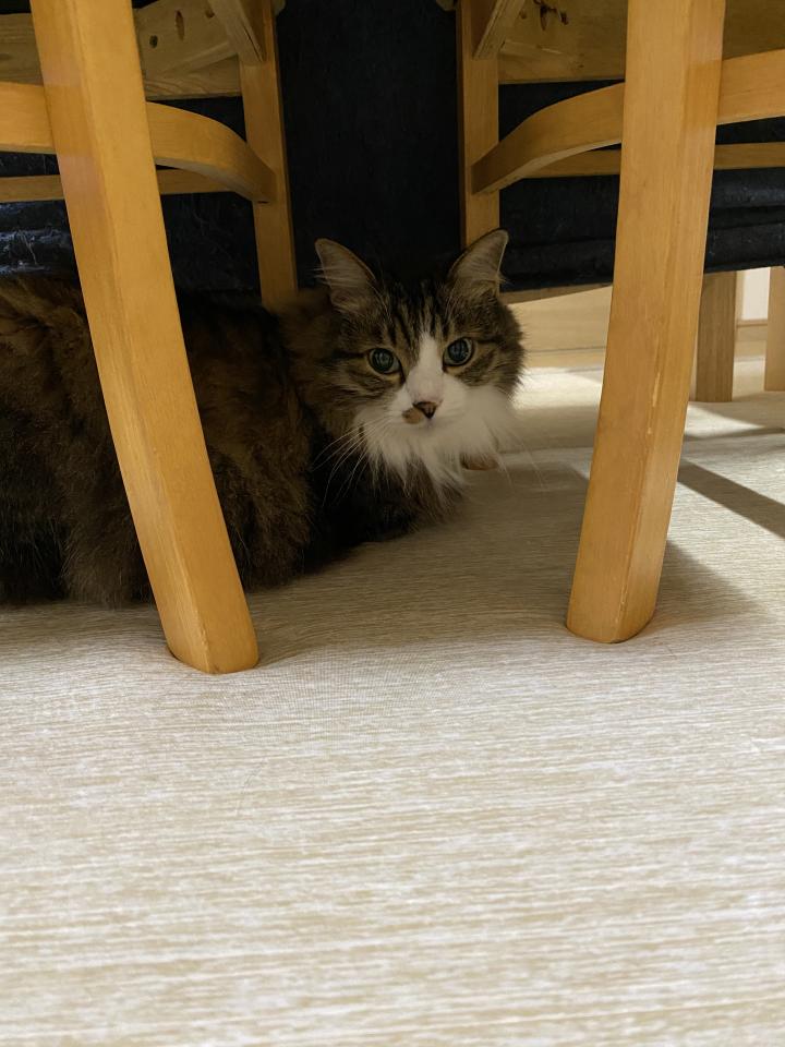 テーブルの下に隠れた不安そうな龍馬君笑笑