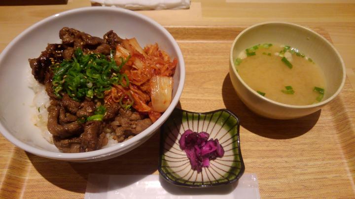 で、このお店のスタンダードは「牛カルビ丼」らしく、牛カルビ丼と思いながらキムチも有ったほうがいいかと牛カルビ丼キムチを選択。