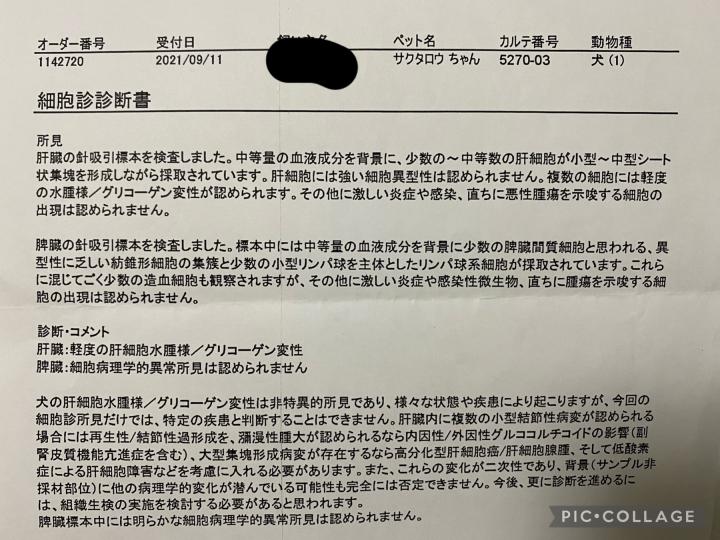 CTで脾臓と肝臓に白く写った部分があったので、針で抜いて細胞診に出した結果、腫瘍らしきものは見つからず。
