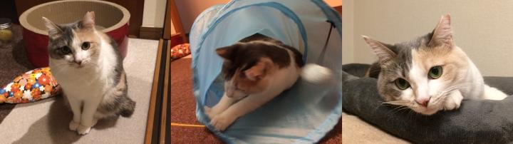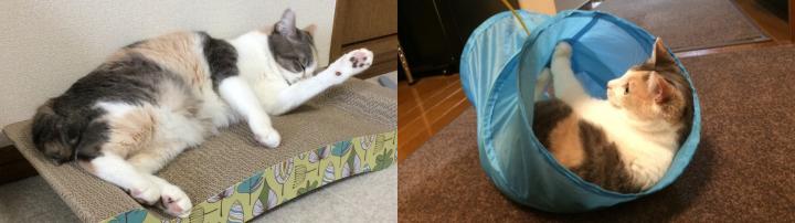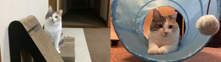 帰宅を出迎えたり、じゃらしとトンネルで遊んだり、くつろいだり。