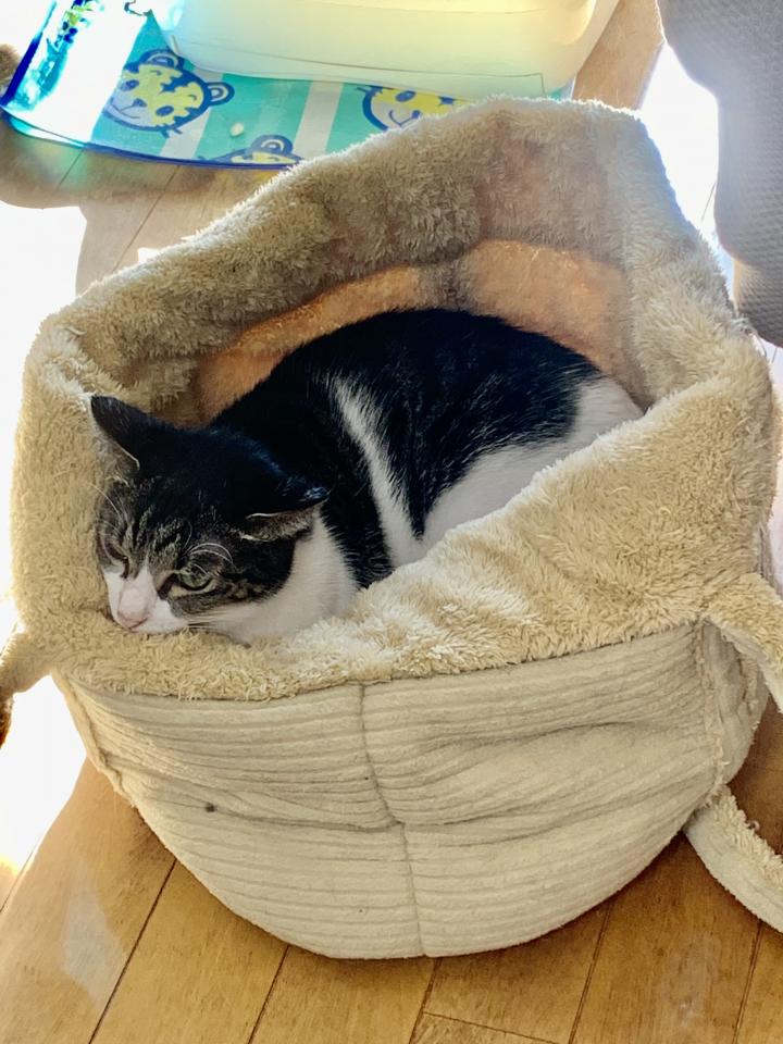 いただきもののモコモコバッグに入ったのは、尿管結石から腎不全で死にかけた真央。元気に復活して穏やかにお昼寝😺