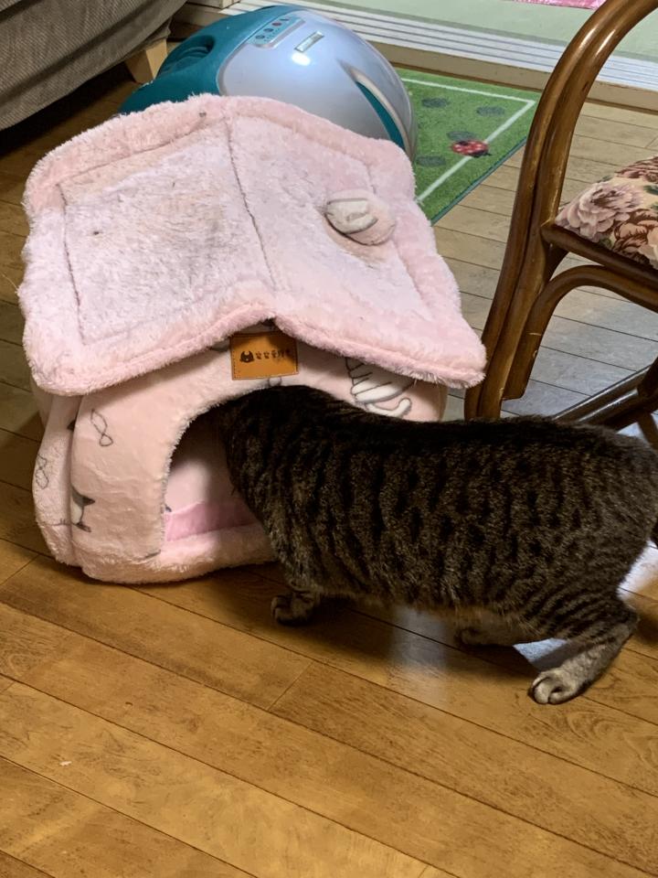 ピンクの屋根付きは、家庭内野良猫の天海ちゃんが入室前に入念にチェック。さすがに警戒心強い子は、新たなものには念入り点検😅