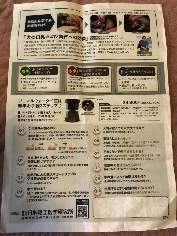 予約をし、生成されたお試し水を飲ませてるけど 今、口臭も無いし、歯の汚れも無い、まだ一歳だから困ったことは無い。