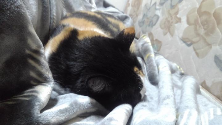 2018年2月、なついていた野良猫を飼う事にしました。 三毛の女の子です。 完全室内飼いしています。外に出たがったりしないので助かります。 抱っこは苦手だけど、添い寝は大好きな娘です。
