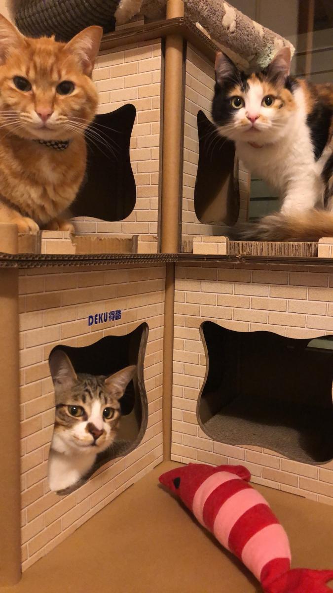 クリスマスプレゼントに買った爪研ぎハウスを仲良く使っています。