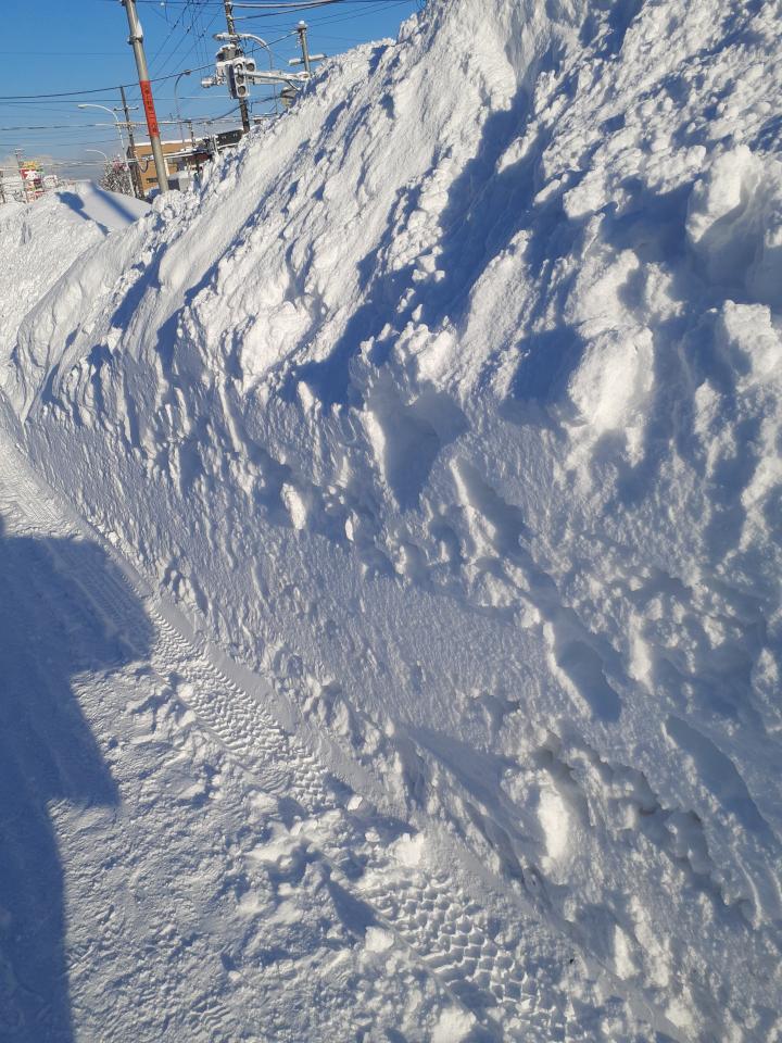 歩道の雪山は断面がバームクーヘンかミルフィーユ🙍