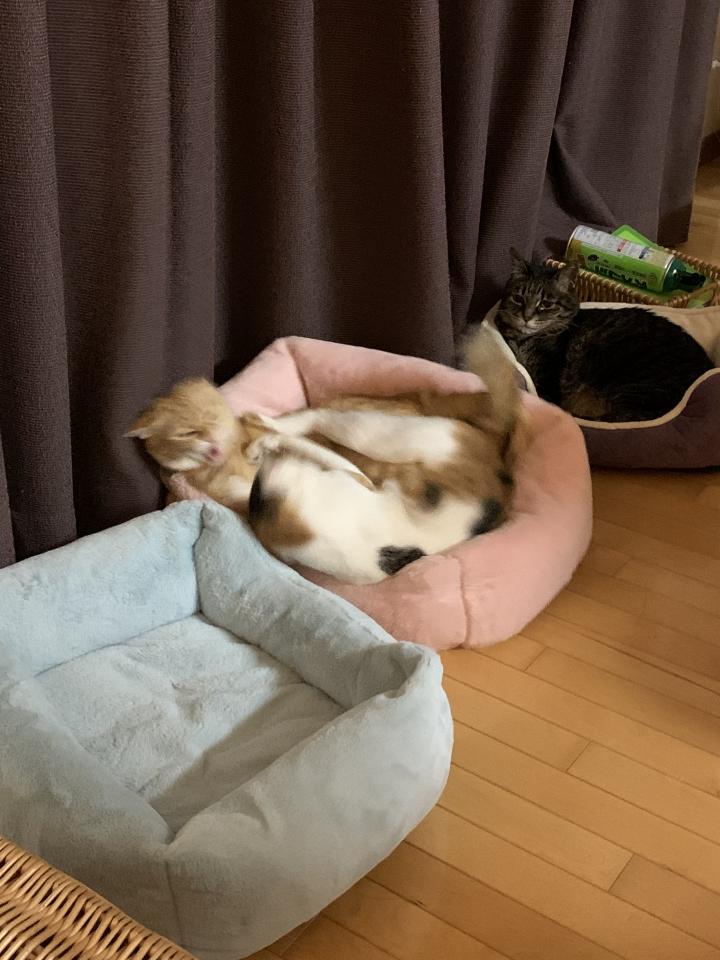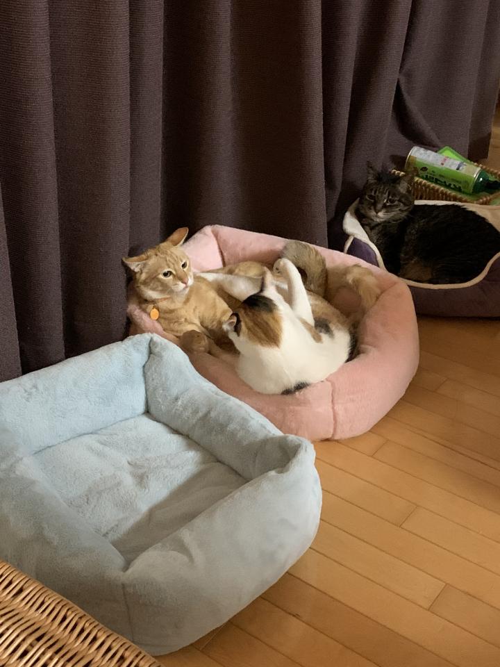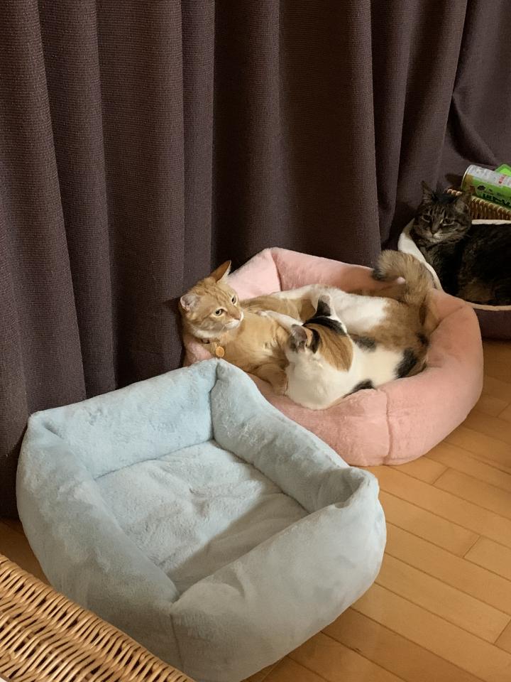 昨日の夜、いつものように このネコベットで こばんと もなかがゴロゴロしていると、やってきました「ヒマを持て余したつむたん😈」が💦