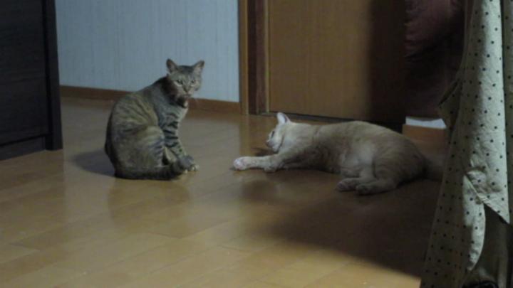二匹で遊んでいます 夫が鬼の居ぬ間にっていうんです 彼らは夫には少し気を許しているようです 福ちゃんがお腹をチャーちゃんに見せています 楽しそうです 信じられない!! もう一年がたっているのに福ちゃんともチャーちゃんとも仲良くなれずにいるのに