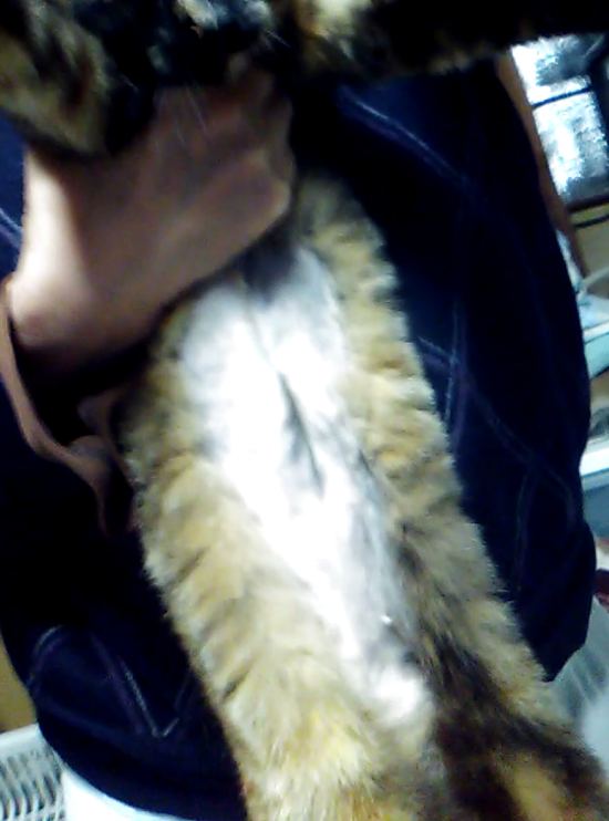 1月の一番寒い時、手術で剃られたお腹の毛はまだ生え揃っていません。