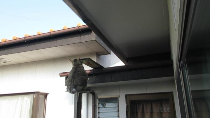 いままでは2段目くらいまでしかいけなかったのですが 必死の覚悟で登って屋根の上から裏口の方に飛び降りたようです 今までなかった行為です